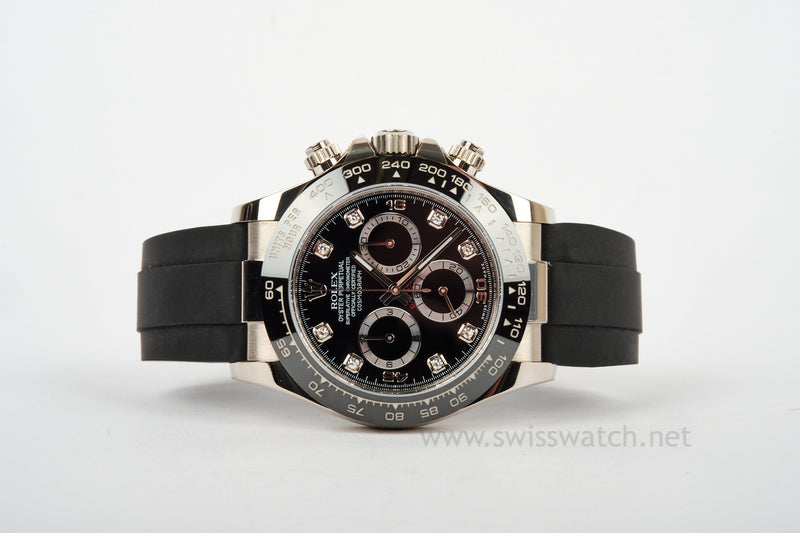 This 18K White Gold 116519LN Rolex Daytona is in very good wrist ready condition sporting the black diamond dial and nearly flawless ceramic bezel. Any blemishes are plainly visible in the listing photos and all are insignificant. As stated, the watch does have some light wear but overall an excellent example of the Rolex Daytona. Keeping excellent time the white gold case has some stickers still on the crown guard as well as the 6 o'clock end piece center polished portion. The diamond dial really pops and this watch no only wears like a dream but would make a great addition to any collection or daily wear watch.