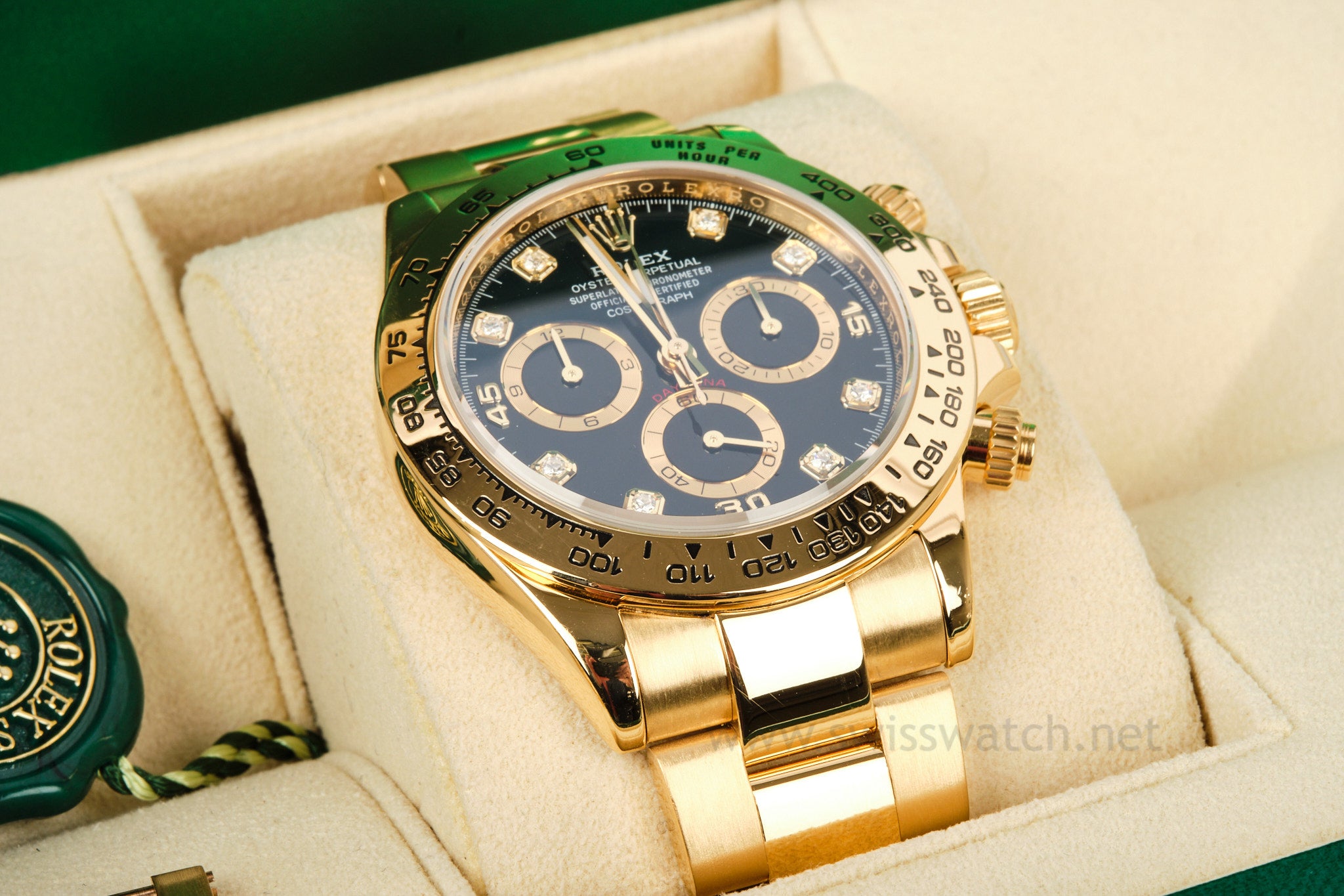 This is a very nice example of the Daytona 116508 in 18K Yellow Gold boasting a factory diamond dial in black. Sports and Elegance collide on this super clean Daytona. There are some insignificant blemishes here and there as to be expected with light wear but there is nothing on the watch that is unsightly without magnification. Our hi-res photos really bring out all the imperfections but again overall this watch is in really good condition. The bracelet is super tight and this watch has all the links.