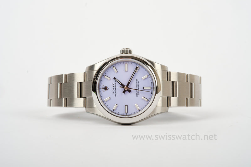 This is an UNWORN Rolex 31mm mid-size Datejust 277200 with stickers on the case, case back, bracelet, and clasp. This is a quickset movement 2236 Caliber and runs spot on. The lavender dial is sought after and great for casual or dressy occasions. Oyster bracelet, smooth bezel.